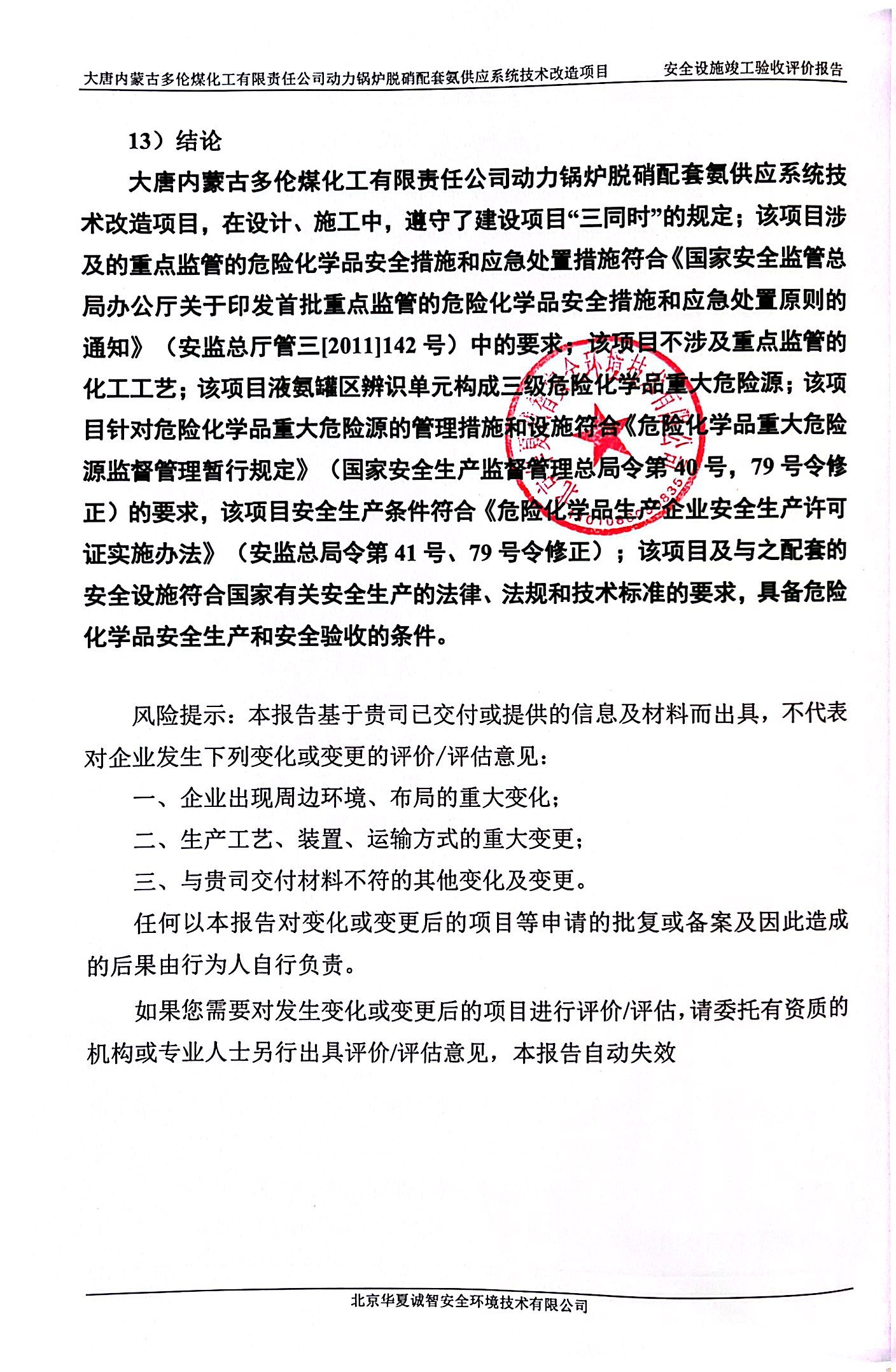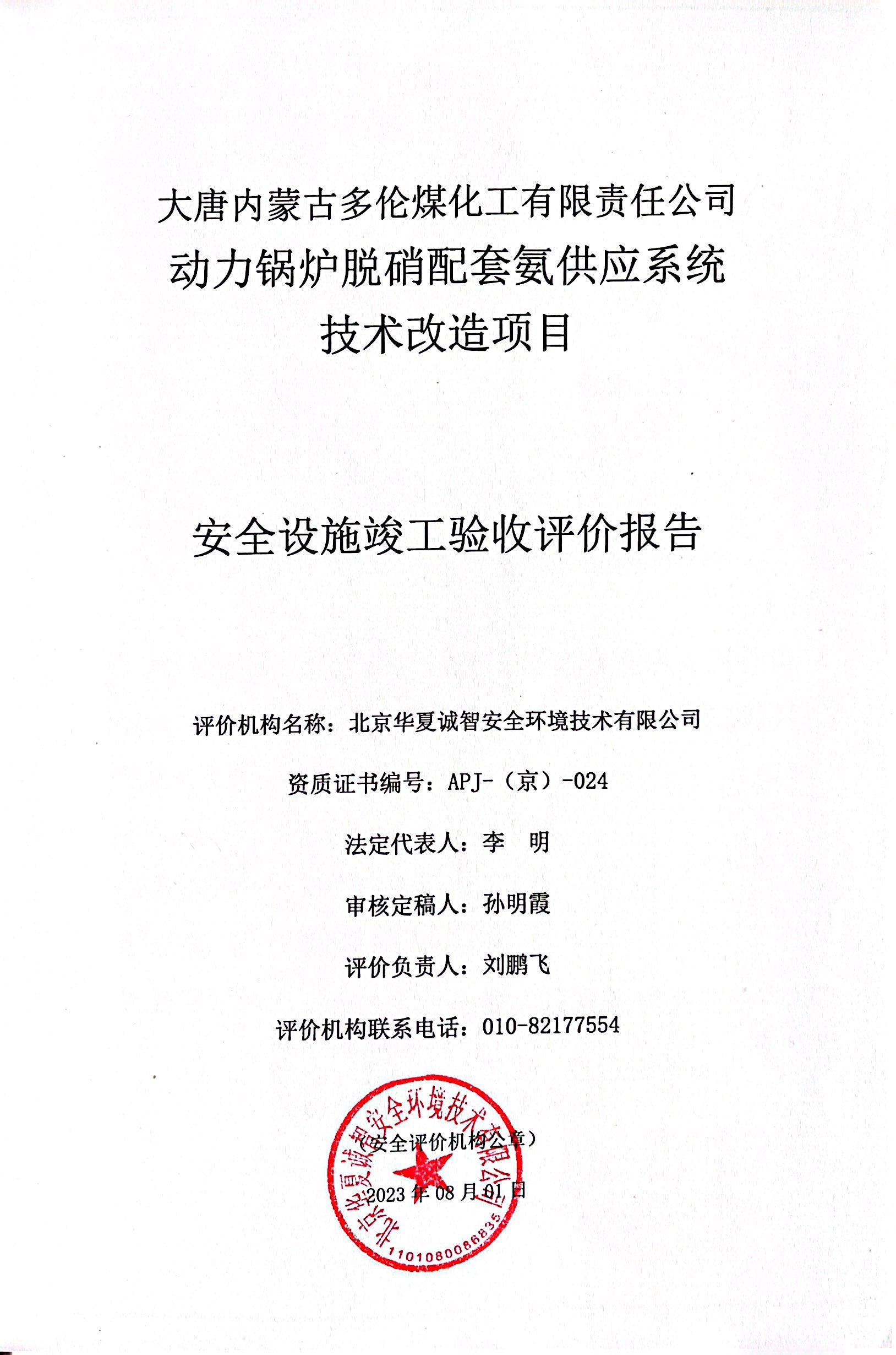 大唐内蒙古多伦煤化工有限责任公司动力锅炉脱硝配套氨供应系统技术改造项目安全设施竣工验收评价 |
